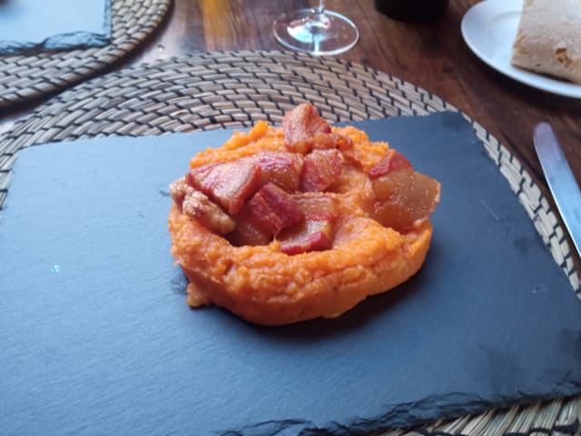Ensalada de pimientos asados salteados con queso de cabra, envueltos en jamón ibérico y huevo poché