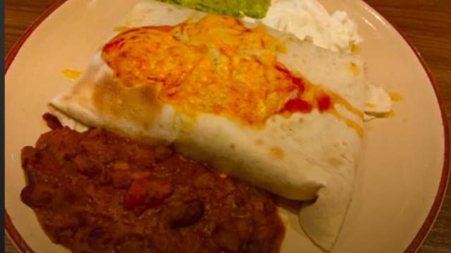 Tortillagerecht. Keuze uit een taco, burrito of enchilada met één van de volgende vullingen: pikante kip, gekruid gehakt, mals gestood