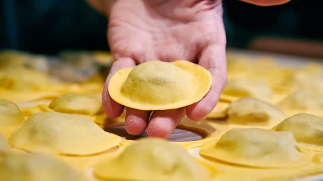 Pasta al huevo casera rellena de calabaza con fondue de queso gorgonzola
