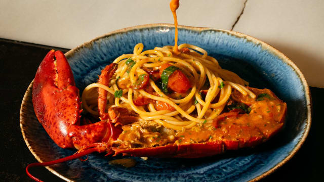 Pasta al huevo de tinta de sepia con pulpo, nduja y salsa de crustáceos