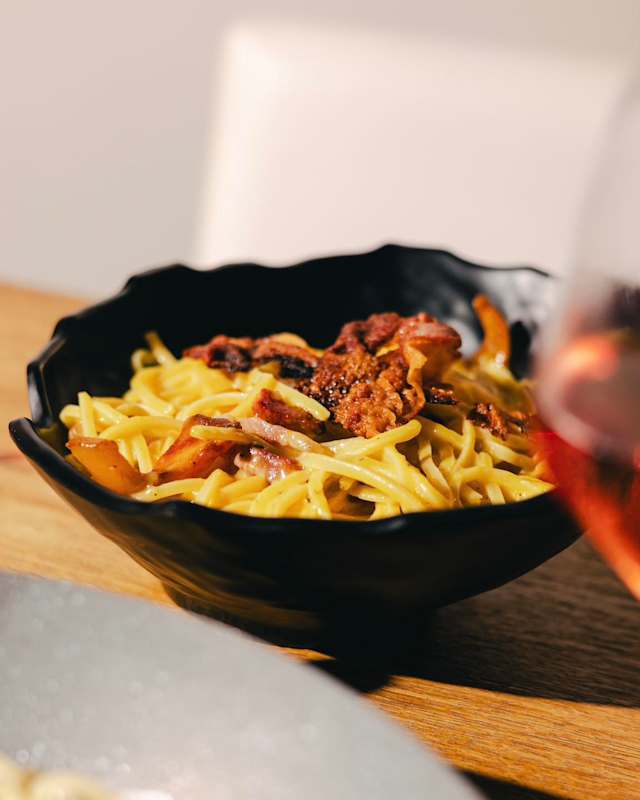 - Mozzarella, pecorino, guanciale di norcia, tuorlo d'uovo pastorizzato scaglie di pecorino e pepe