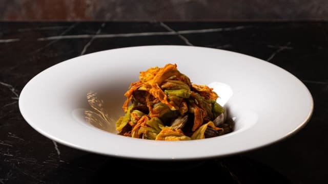 Alici dorate e fritte, stracciata di bufala, datterino semi dry, scarola croccante