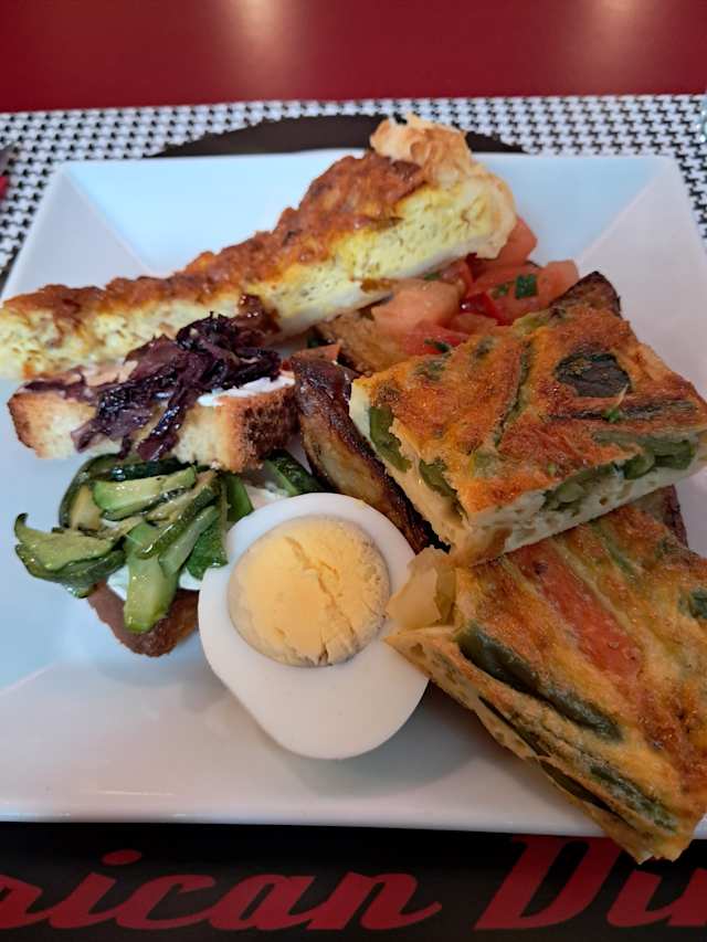 - Tonno, uovo sodo, olive, insalata, pomodorini e mais, servita con crostini di pane