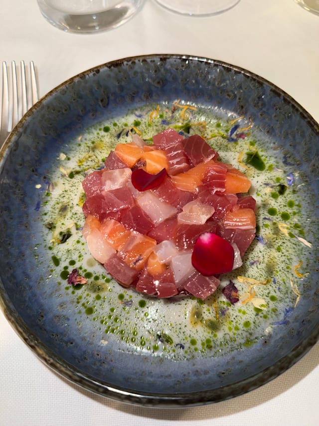 tartare di tonno, salmone e branzino, yuzu, latte di cocco e maracuja aromatizzato al bergamotto.