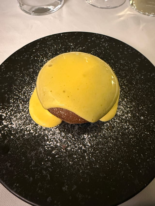 con cuore caldo aromatizzato alla fava tonka con crema allo zabaione morbido al Ben Ray.