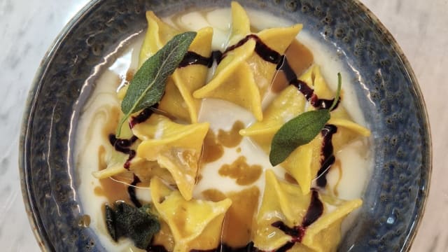 con fonduta di pecorino, salsa demi-glace, salvia fritta e riduzione al barolo.