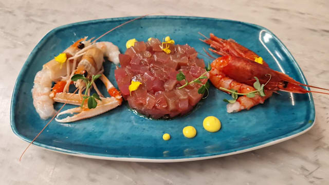 un'ostrica Krystale, un gambero*, uno scampo* e carpaccio di tonno, salmone e branzino.