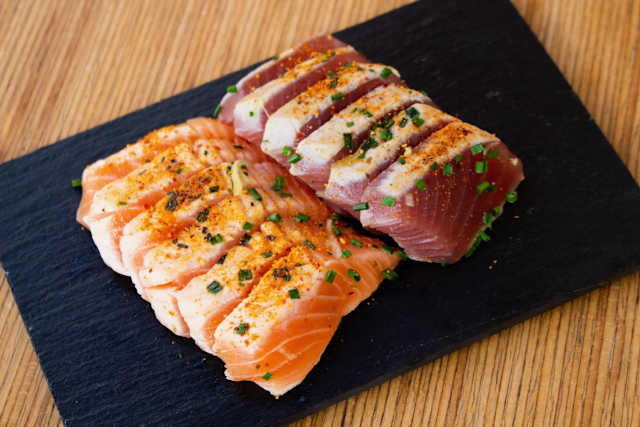 - 3 Sashimi saumon, 3 sashimi thon, 3 sushi thon, 3 sushi saumon. (nos combos sont accompagnés d’une entrée au choix uniquement le midi: salade, concombre, wasabi / salade de choux / soupe miso)