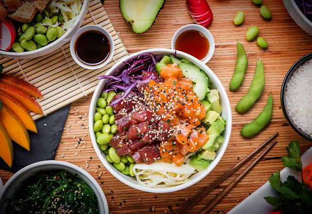 - Edamame, dés de saumon et de thon mariné, choux rouge et choux blanc, avocat, concombre