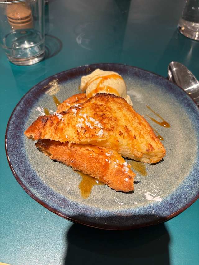 - Brioche perdue, glace vanille, caramel.