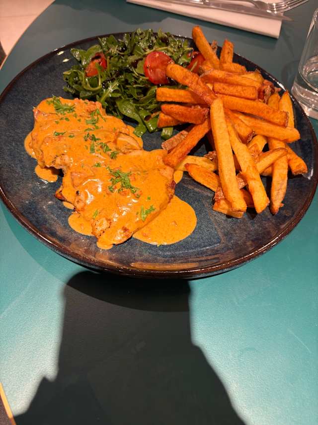 - Suprême de poulet, patate douce rôtie et jus de volaille maison.