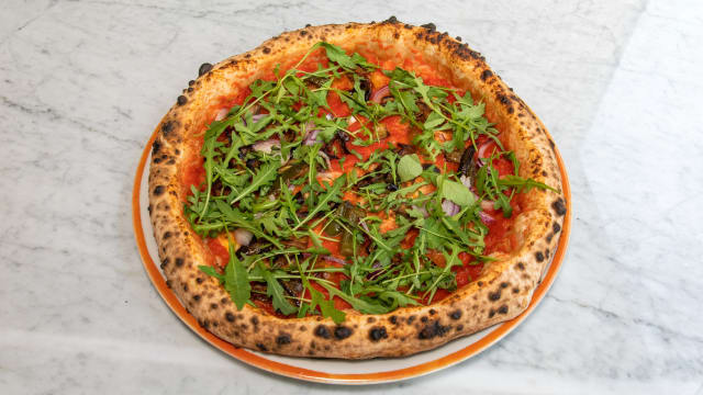 Sauce tomate, Charcuterie ou viande au choix, mozzarella fumée, grana padano, ricotta, poivre noir, tomates, basilic