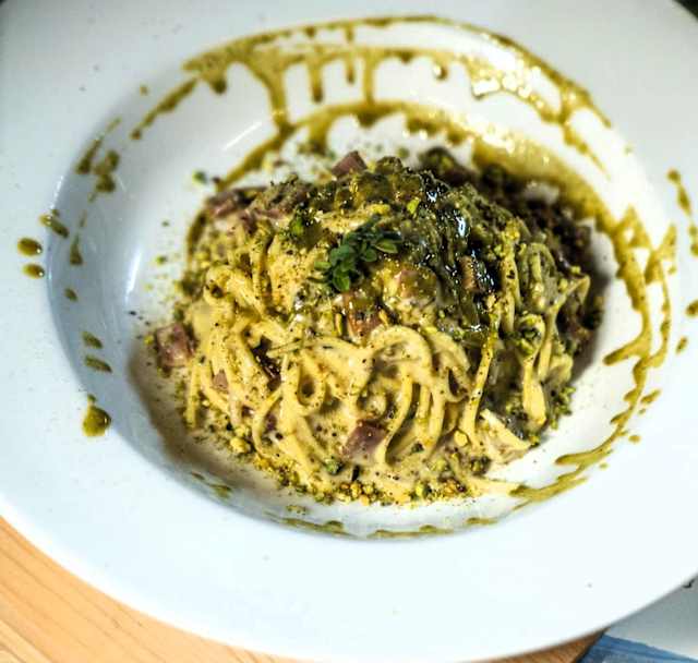 - Taglierini al pistacchio di bronte, pancetta e cipolla