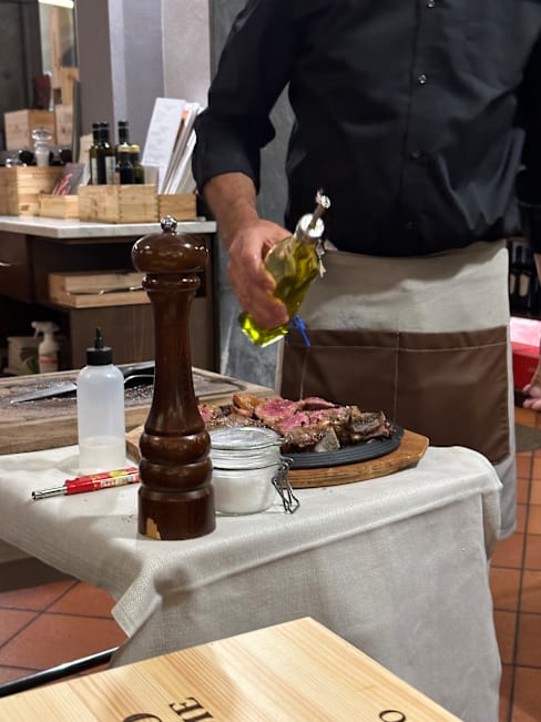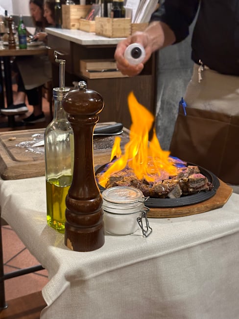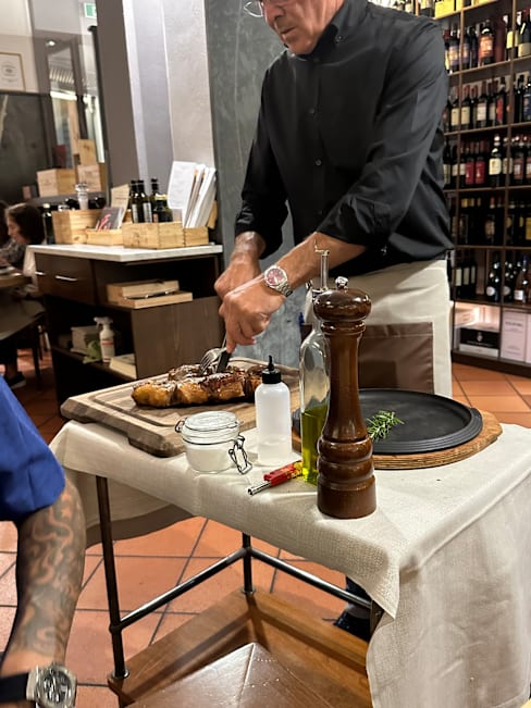 10/10The meal was like a performance primarily because we ordered what is likely the house speciality, the real “bistecca fiorentina”. A wonderful performance because the staff present —-close to the table the grilled meat (sold by the kilo and minimum two persons ). —-slice it up, generously sprinkle with olive oil, salt and pepper (I believe) and light it all on fire. The flames are short lived but remain long enough to sear the meat just a bit more to make it perfetto. Not to be missed while in Florence! One note of caution: don't make the same mistake as I did and wait patiently for the bill at the end. March right up to the counter like the Italians and pay at the register. Lovely experience and memory!