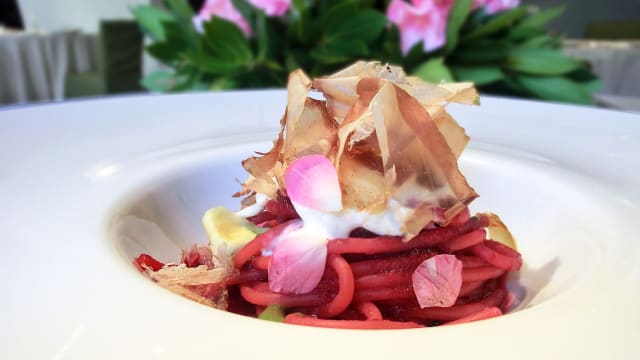 Chitarra al ragù di capriolo, rapa rossa e kefir