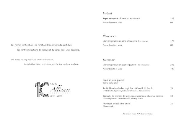 9.5/10+1We had an incredible experience at Alliance! The service was excellent and the food was somehow even better. We were celebrating my birthday, and the staff truly made it feel special from the moment we arrived. My fiancé has a severe allergy, and the team went above and beyond to take special precautions — they adjusted the menu seamlessly without sacrificing any flavors or presentation. It’s rare to find a restaurant that handles allergies with such care and confidence. Unfortunately, we had to leave a bit quickly toward the end because my fiancé may have been exposed to something in the air, but even with the abrupt exit, we were blown away by the entire experience. We can’t wait to come back the next time we’re in Paris — highly recommend!