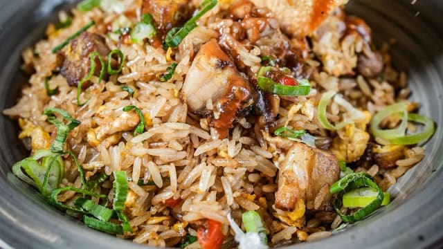 Riso, bocconcini di pollo / carne / misto, uova, cipollotti, salsa di soia e spezie