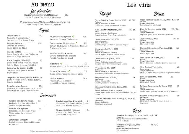 CorsicanFrenchMediterraneanEuropeanTapasBachelor partyBistroContemporary cuisineGood for familiesLunchRomanticTrendyWith friendsGluten freeLactose intoleranceLocally producedNut allergiesPeanut allergyVegan dishesVegetarian dishesAmerican ExpressCellarWifi