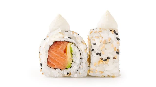 - Salmone* e avocado con topping di philadelphia e semi di sesamo misti