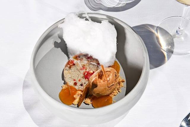 Bomba de tomàquet amb burrata, vinagreta de festuc acabada amb sorbet d’alfàbrega