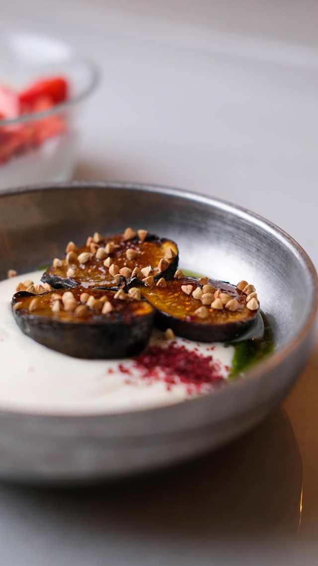- Cebolas assadas, fruta da época, pinhões e vinagrete de melaco de rõma