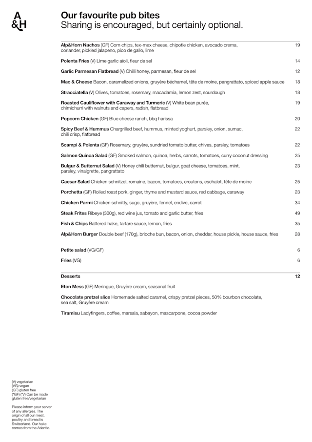 Does Alp&Horn have special offers currently? How is Alp&Horn rated? Can I reserve at Alp&Horn right now? What type of cuisine is served at Alp&Horn? Does Alp&Horn serve brunch? Is Alp&Horn trendy? Does Alp&Horn have a bar?