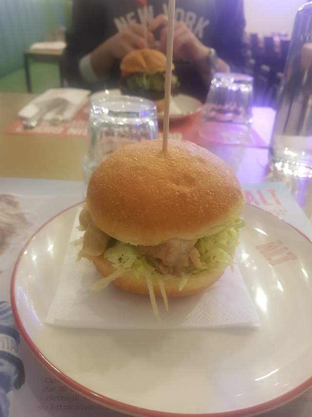 - Con hamburger di manzo, maionese, crema di pomodoro speziata, cetriolo marinato, iceberg, misticanza, cipolla rossa in agrodolce