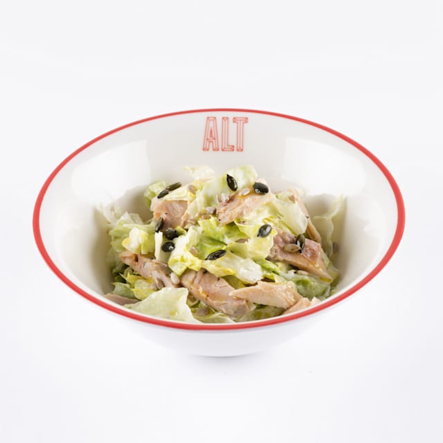 Focaccia con arrosto di manzo, misticanza e maionese con senape