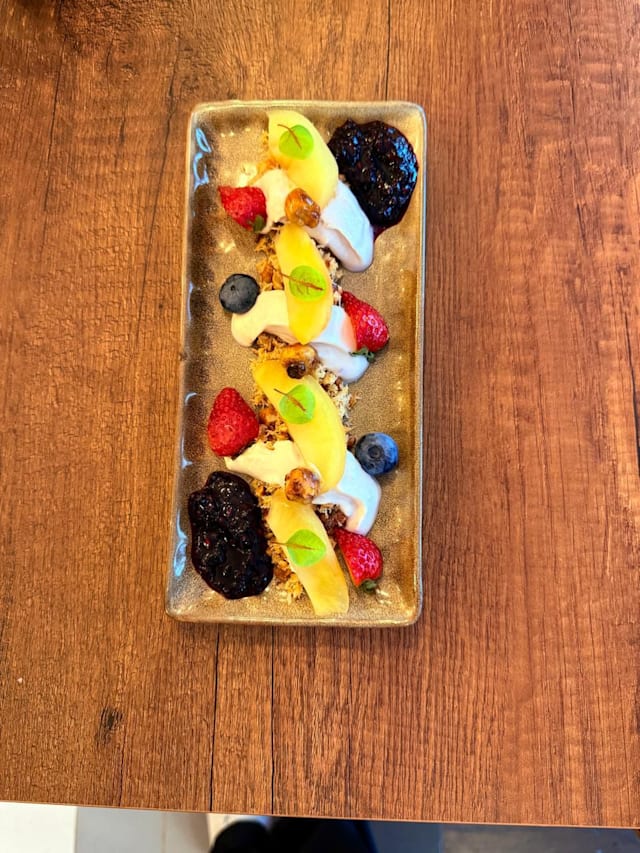 - Une fine konafa croustillantes, noisettes, marmelade de mûres, une pomme poché, crème légère.