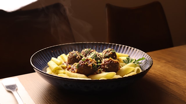 - Penne, boulette de viandes, ail, tomates, huile d'olive extra vierge, persil, piment rouge (facultatif).