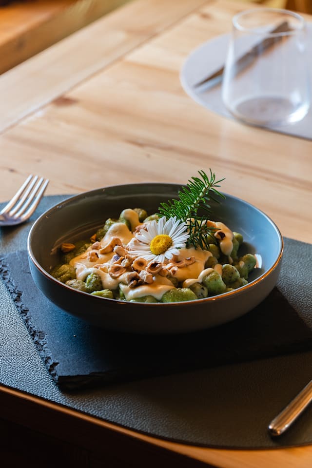Gnocchi di ortica con burro d'alpeggio, erbe di montagna, fiori e fontina della fromegerie d'ayas