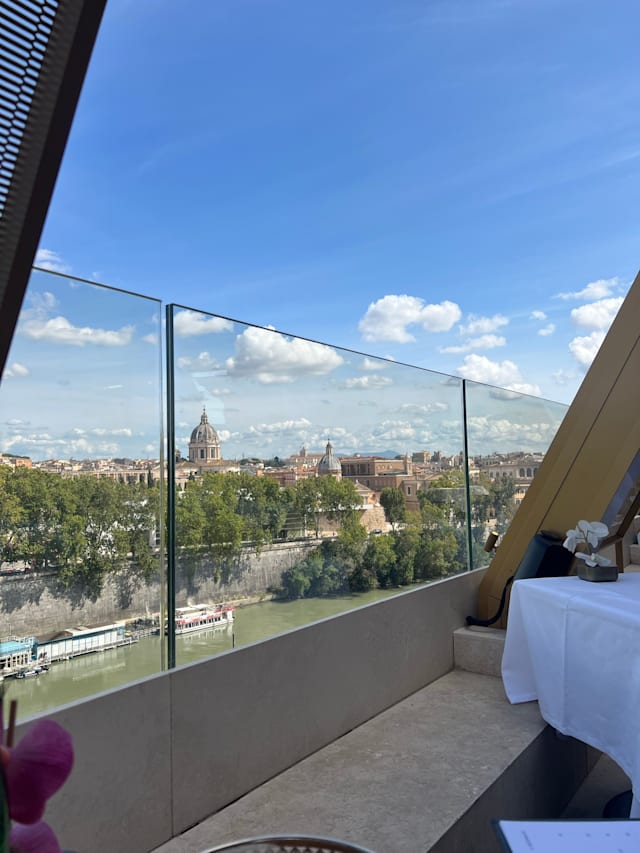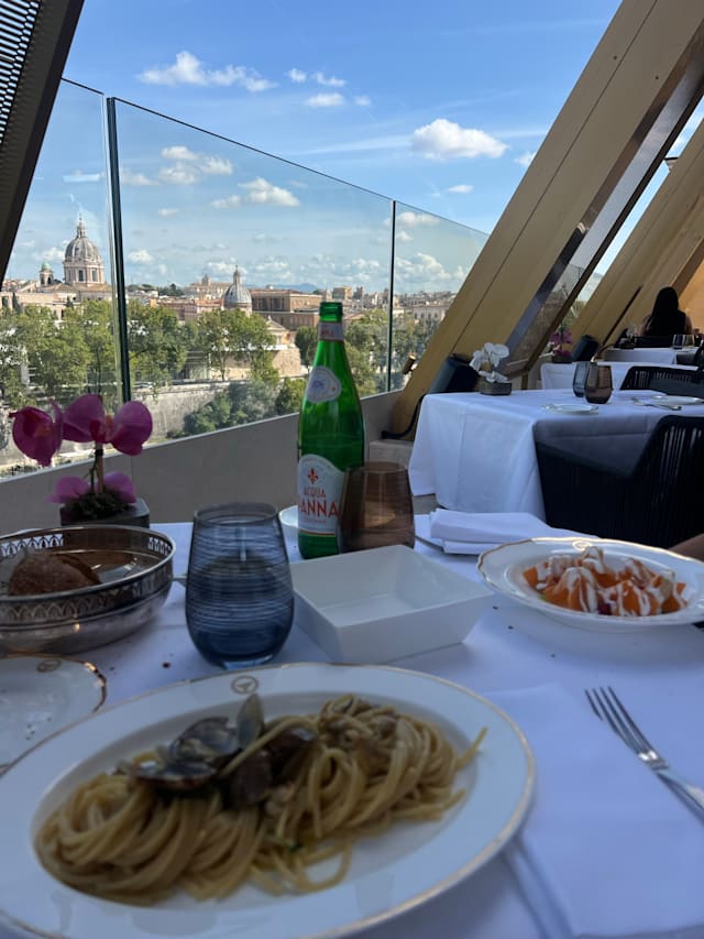 9.5/10We booked a table in this restaurant for a special occasion when visiting Rome. Especially enjoyed the view as we sat close to the windows. The restaurant has nice atmosphere, lights are slightly dimmed, great taste decor, comfy seats, overall really cousy place. Also we were not disappointed by the food. From the mains we tried cod and risotto - delicious. Our waiter helped us with apperitf and wine selection - quite a selection to choose from. We definitely recommend.