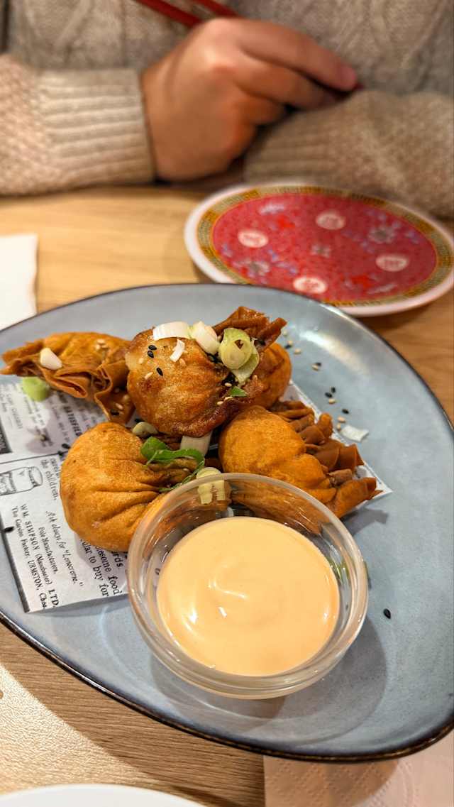 - Ravioles frites farcies à la crevette, sésame et ciboulette. Sauce mayo spicy.