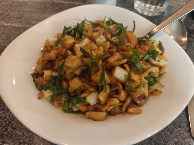 9/10The cafe is small. For about 4-5 tables. The kitchen, as I understand it, is also small, so the range of dishes is the most minimal, this dish is Momo - ordinary Tibetan dal soup and 1 more pasta soup with vegetables. The ingredients of the dishes are prepared from pork. Either vegetarian or beef. So that I can recommend: you need to add chicken to the dishes, because there are people who do not eat pork and beef. At the same time, they are not vegetarians. Maybe you could make fewer dishes with a lot of dough and more dishes with only meat?