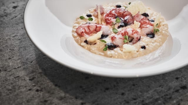 Riso acquerello alla barbabietola, fonduta di pecorino, battuta di manzo, lamponi, nocciole tostate, polvere all'aglione