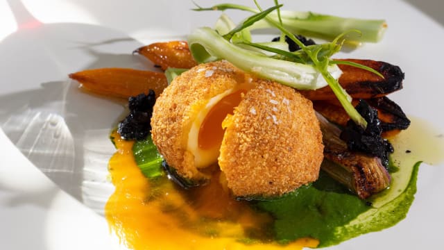 - Brodo tiepido di capocollo affumicato, tuorlo marinato alla soia, salsa all'erborinato di capra e culatello