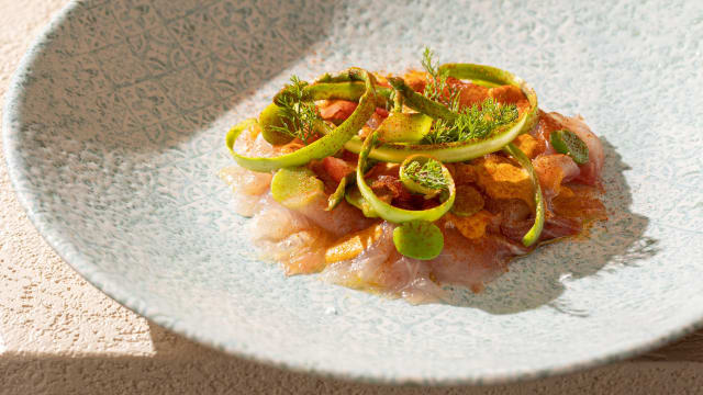 - Mosaico di selezioni di pesce maturato, gocce di datterino, tuorlo d'uovo marinato e finocchio marino