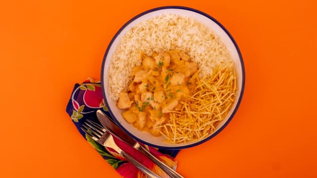 (Cubos de frango, queijo creme, cebola caramelizada e bacon)