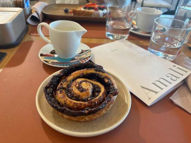 - Toasted brioche bread with custard, salted pistachio cream, chopped pistachios, white chocolate chips and a pinch of salt.