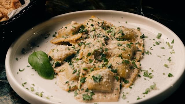 Gevulde ravioli met zwarte truffel en witte roomsaus