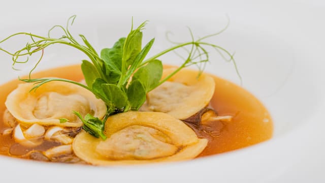 - Mushroom and Ginger Dumplings, Mushroom Purée, Iberian Prosciutto, Wasabi Foam and Ham Hock Broth