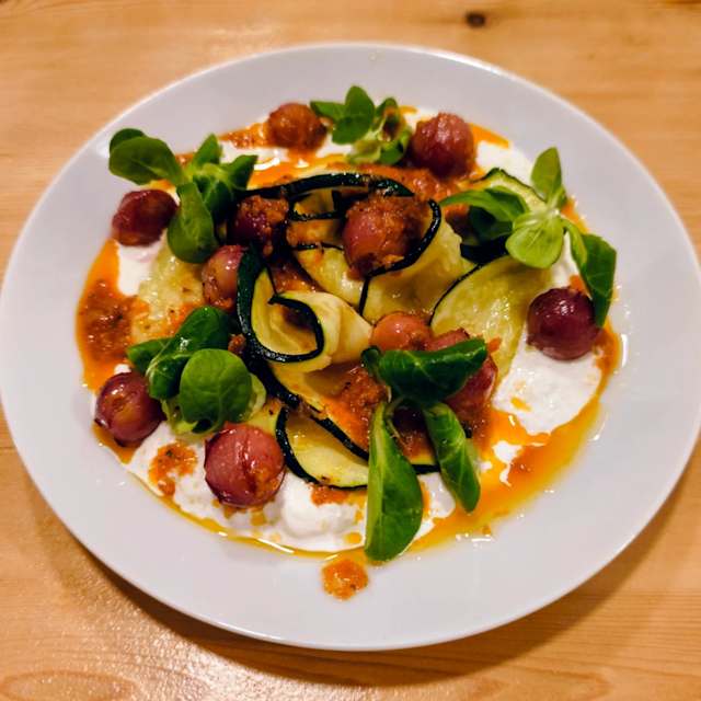 - Uvas asadas, calabacín y vinagreta de tomate seсо