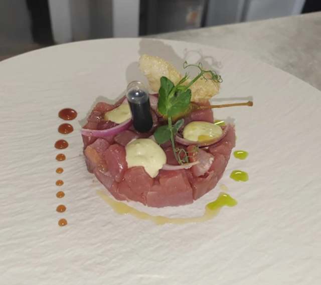 - Tataki di tonno con cipolla carameltata e pomodorini confit