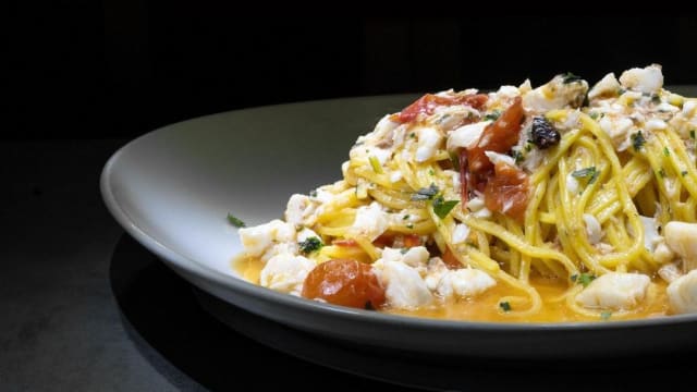 Linguine pasta with seafood, in tomato sauce (mussels, clams, calamari* and prawns*)