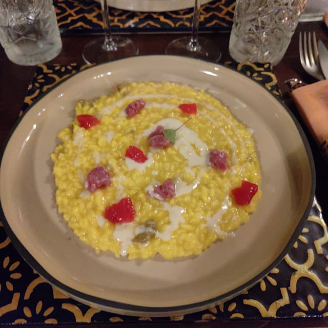 Risotto riserva san massimo, zafferano iraniano, salsiccia di bra cotta & cruda, fonduta di fontina della val d’aosta e gelèe di campari (minimo 2 persone)