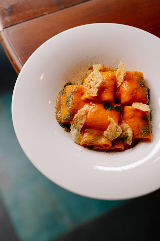 Mezzo pacchero del pastificio agricolo mancini, pomodoro bio di lucera dell’azienda petrilli mantecato con parmigiano reggiano, polvere di basilico e cialda croccante di vacche rosse