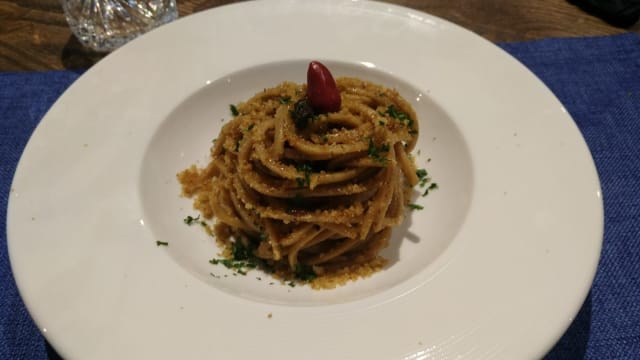 Linguine al ragu’ di polpo e mollica croccante aromatizzata ai capperi