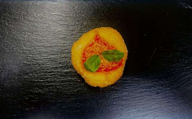 - Parmigiana di melanzane tricolore con salsa al datterino, fonduta di grana padano 36 mesi e salsa al basilico