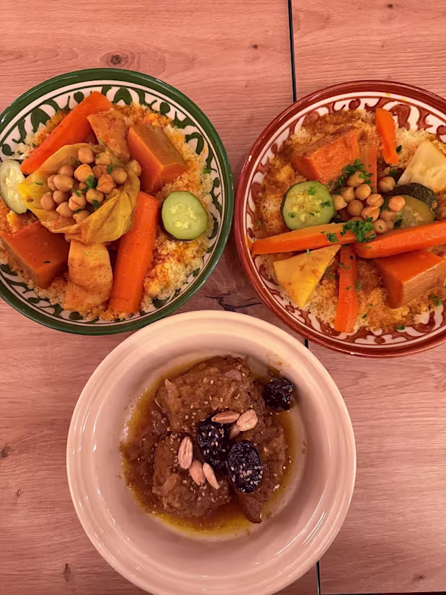 - Cous cous cotto lentamente al vapore con mix di verdure e brodo speziato