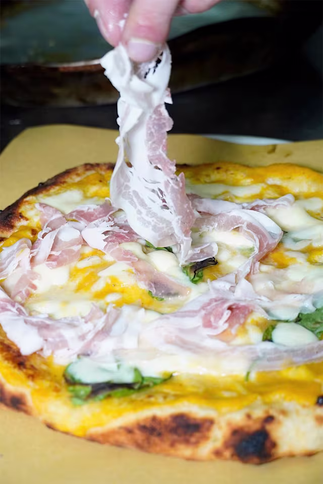 - (prosciutto crudo, fiordilatte, rucola, pomodorini, scaglie di parmigiano, basilico, olio EVO)